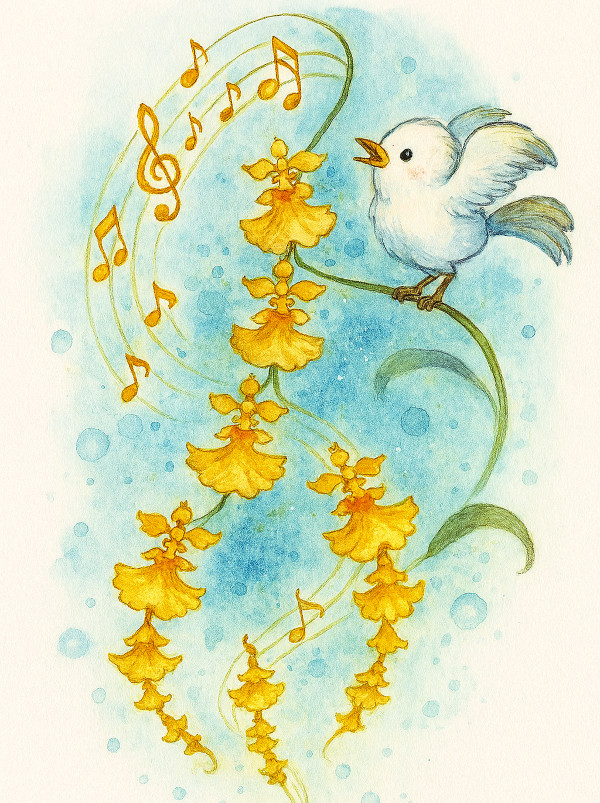 シマエナガさんが囀りながら指揮をすると、そのメロディに合わせて黄色いオンシジューム(Oncidium、学名:Oncidium hybrids)たちが まるで小さな踊り子のように列をなして、クルクル舞いながら音符の風に乗って青い空へ昇っていく幻想的イラストです。