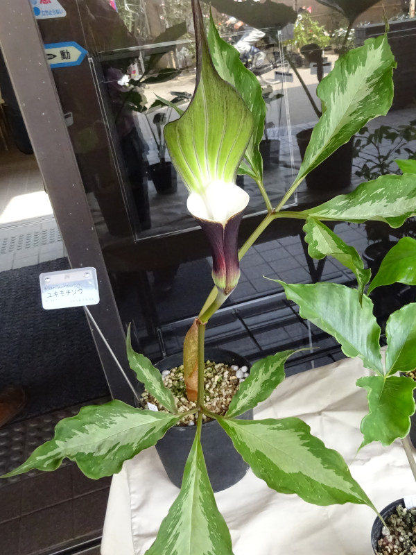ユキモチソウArisaema sikokianum ポスト らんまん植物,有毒植物撮影場所: 京都府立植物園撮影場所: 富山県中央植物園撮影場所: 京都府立植物園撮影場所: 京都府立植物園撮影場所: 六甲高山植物園撮影場所: 高知県いの町撮影場所: 富山県中央植物園撮影場所: 富山県中央植物園花名ユキモチソウ学名Arisaema sikokianum別名Japanese Jack-in-the-Pulpit, 雪餅草, Arisaema, Yukimochisou, Gaudy jack原産地四国と三重県、奈良県(日本)開花場所植物園, 低山, 亜高山, 園芸品種開花期4月, 5月花言葉「苦難の中での力」 ユキモチソウとは可愛いけど、猛毒 ユキモチソウ(雪餅草、学名:Arisaema sikokianum)は、日本原産で、サトイモ科テンナンショウ属の多年草です。四国と本州の一部(三重県、奈良県)の山野の湿った林床に自生します。草丈は20~30 cmです。 4月~5月に、偽茎に2枚の葉を付け中央から1本の花茎を伸ばします。葉は鳥足状に付きます。仏炎苞は長さ8~12 cmで、紫褐色地に淡紫褐色と白のストライプが入り、先端が尾状に伸びます。仏炎苞は口辺部から下部の内側は白い。仏炎苞に包まれた肉垂花序の付属体は直径2~2.5 cmで、先端が白い雪餅のように膨らみ少し仏炎苞からはみ出します。 花被片はありません。雌雄異株ですが、すべての株は、最初は雄株であり、成熟するにつれて雌株に変わる性転換植物です。花の状態が悪いと雌株でも雄株に変化します。付属体の面白さから園芸植物として栽培されています。残念ながら全草が有毒です。 花名の由来 属名の「Arisaema」は、ラテン語で「Arum(サトイモ科アルム属)」+同じくラテン語で「aima(血のような赤色)」の複合語で、品種によっては葉に赤斑点があることに拠ります。種小名の「sikokianum」は「四国の」と言う意味で原産地に因みます。和名の「ユキモチソウ(雪餅草)」という名前の由来は、特異な付属体の色と形に拠ります。 テンナンショウ属の仲間 同じテンナンショウ属にウラシマソウ(浦島草)や、マムシグサ(蝮草)と似ています。 ■ユキモチソウ、ウラシマソウ、マムシグサ ウラシマソウ(浦島草)左、 ユキモチソウ(雪餅草) 中央、 マムシグサ(蝮草)右 花言葉 花言葉は「苦難の中での力」。 一般名:ユキモチソウ(雪餅草)、学名:Arisaema sikokianum、別名:Yukimochisou、Gaudy jack、Japanese Jack-in-the-Pulpit、分類:植物界被子植物単子葉類オモダカ目サトイモ科テンナンショウ属ユキモチソウ種、原産地:本州の一部(三重県、奈良県)と四国、草丈:20~30 cm、雌雄異株、仏炎苞長:8~12 cm、付属体径:2~2.5 cm、花被片:無、開花期:4月~5月、残念ながら全草有毒。 ■関連ページ ユキモチソウ(雪餅草、学名:Arisaema sikokianum) 特集 毒草 特集 高山植物 富山4 ユキモチソウ(雪餅草、Arisaema sikokianum)かぎけん花図鑑 花日記2024年5月9日(木)、目オモダカ科サトイモ属テンナンショウ種ユキモチソウ花のタイプ放射相称花花序肉穂花序花冠花びら無し葉形3出複葉葉縁全縁生活型多年草花の色白葉の色緑実の色高さ20.0 ~ 30.0 cm花径2.0 ~ 2.5 cm ランダムな花アリウム・クリストフィーコケバラゲンカイツツジオギベニバナインゲンオオムラサキ