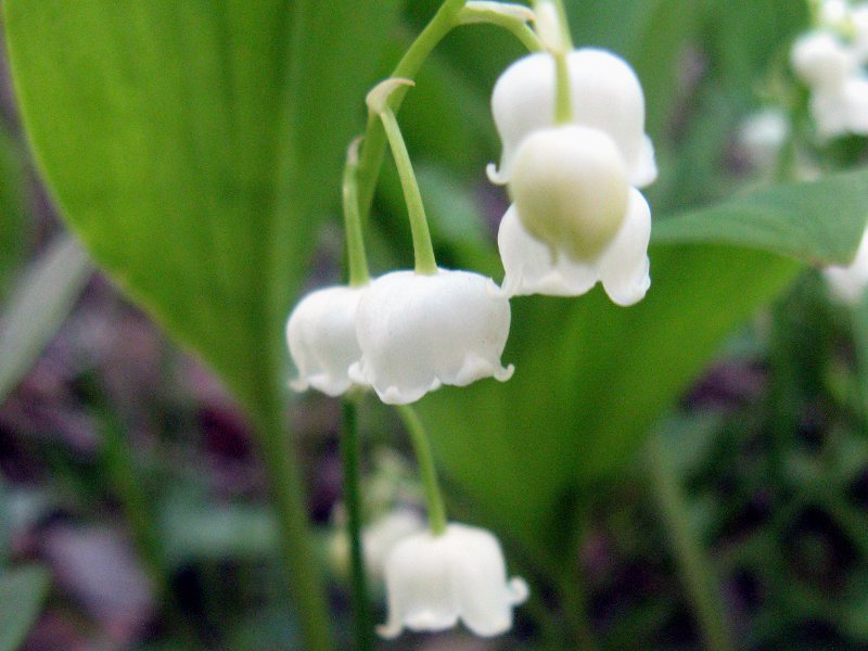 ドイツスズラン(Convallaria majalis)、別名:谷間の姫百合、草丈:15~20 cm、葉長:15~20 cm 、葉形:長楕円形、開花期:4月~6月、葉色:緑色(表)、濃緑色(裏)、花色:白、ピンク(園芸品種ピンクスズラン:C. majalis var. rosea)、花の付き方:多数付く、芳香:有(香水の原料)、花径:1~1.5 cm、花形:釣鐘型、果実径:1-1.5 cm、果実色:赤、注記:全草が有毒植物で特に花や花粉、根が猛毒、強心剤、香水の原料。